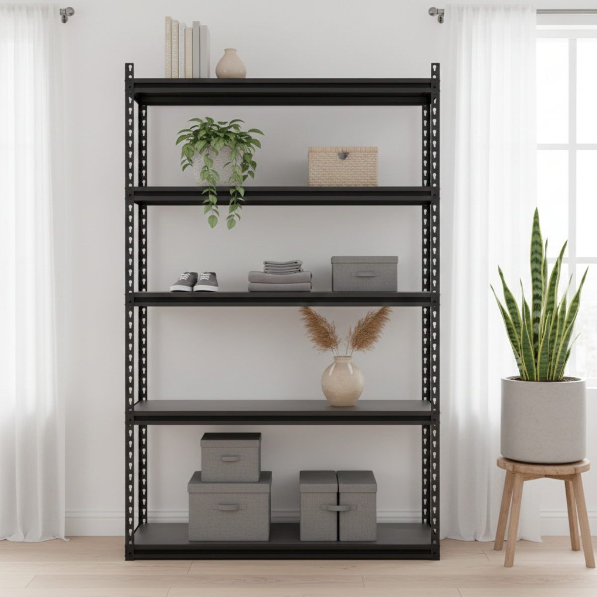 - Transforma y optimiza tu espacio con nuestro Estante Metálico de 5 Niveles en un elegante acabado negro. Este estante está diseñado para ofrecer la máxima resistencia y versatilidad, permitiéndote organizar todo tipo de objetos pesados con total confianza.Características Destacadas: